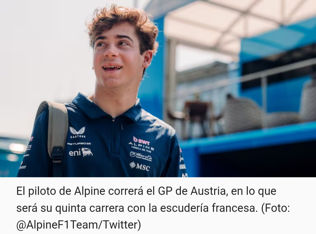 El piloto de Alpine correrá el GP de Austria, que será su quinta carrera con la escudería francesa. Franco Colapinto…