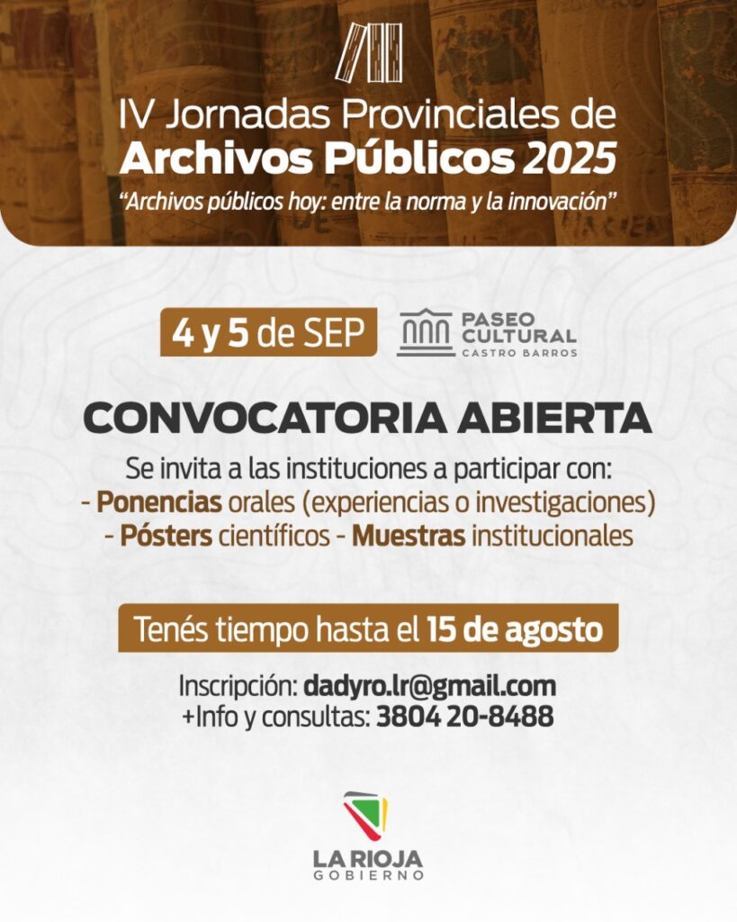 El Gobierno de La Rioja, a través de la Dirección de Archivo, Digesto y Registro Oficial de la provincia de La Rioja, dependiente de la Secretaría General de la Gobernación, invita a participar de las IV Jornadas Provinciales de Archivos Públicos, que se desarrollarán los días 4 y 5 de septiembre en el Paseo Cultural Pedro Ignacio de Castro Barros. La recepción de propuestas es hasta el 15 de agosto próximo.