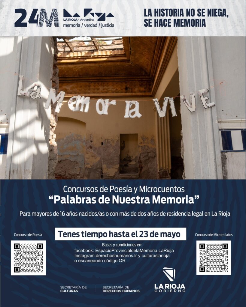 A través de la Secretaría de Derechos Humanos y la Secretaría de Culturas, el Gobierno de La Rioja lanza una nueva edición del programa Letras en Conexión, con la apertura de inscripciones para el Segundo Concurso de Poesía y el Cuarto Concurso de Microrrelatos «Palabras de Nuestra Memoria».