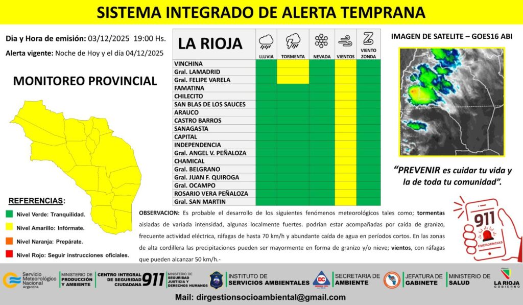 El alerta rige para Vinchina, General Lamadrid y General Felipe Varela y, según el reporte del SIAT, en la zona podrían producirse tormentas aisladas de variada intensidad, algunas localmente fuertes y que podrían estar acompañadas de granizo, frecuente actividad eléctrica, abundante caída de agua en periodos cortos de tiempo y ráfagas de viento de hasta 70 kilómetros por hora.