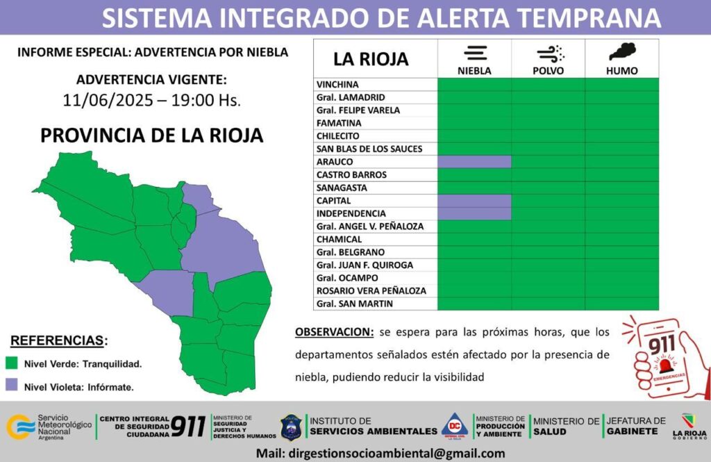 Por otro lado, el SIAT difundió un alerta por la posible presencia de niebla que afectará a los departamentos Capital, Independencia y Arauco.