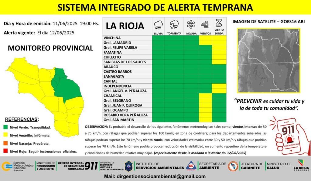 A su vez, el reporte alertó sobre la presencia de viento zonda para los departamentos Vinchina, General Lamadrid, General Felipe Varela, Famatina, Chilecito, San Blas de los Sauces, Independencia y General Ángel Vicente Peñaloza.