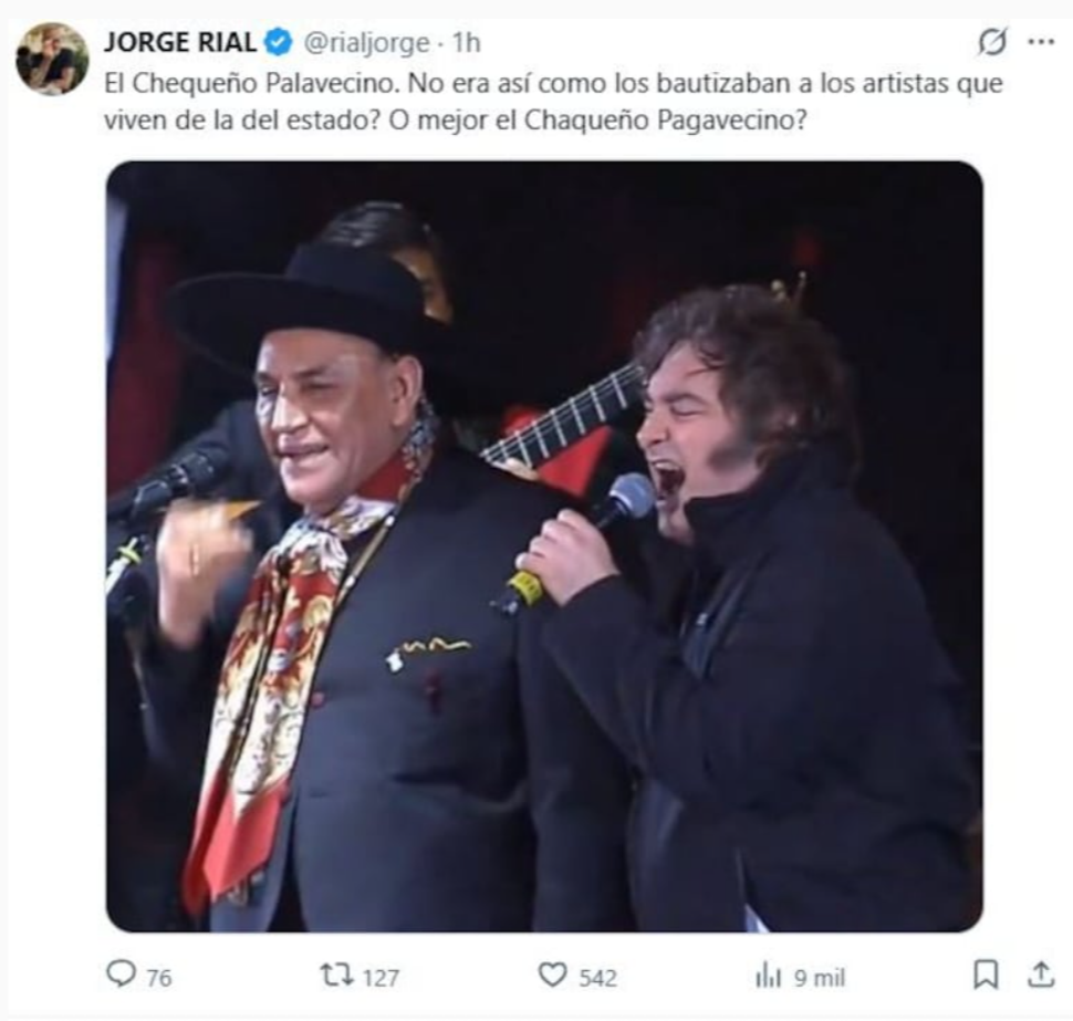 “El Chequeño Palavecino. ¿No era así como los bautizaban a los artistas que viven de la del Estado? ¿O mejor el Chaqueño Pagavecino?”, escribió Rial en un mensaje cargado de ironía, haciendo referencia al vínculo de algunos artistas con fondos estatales.