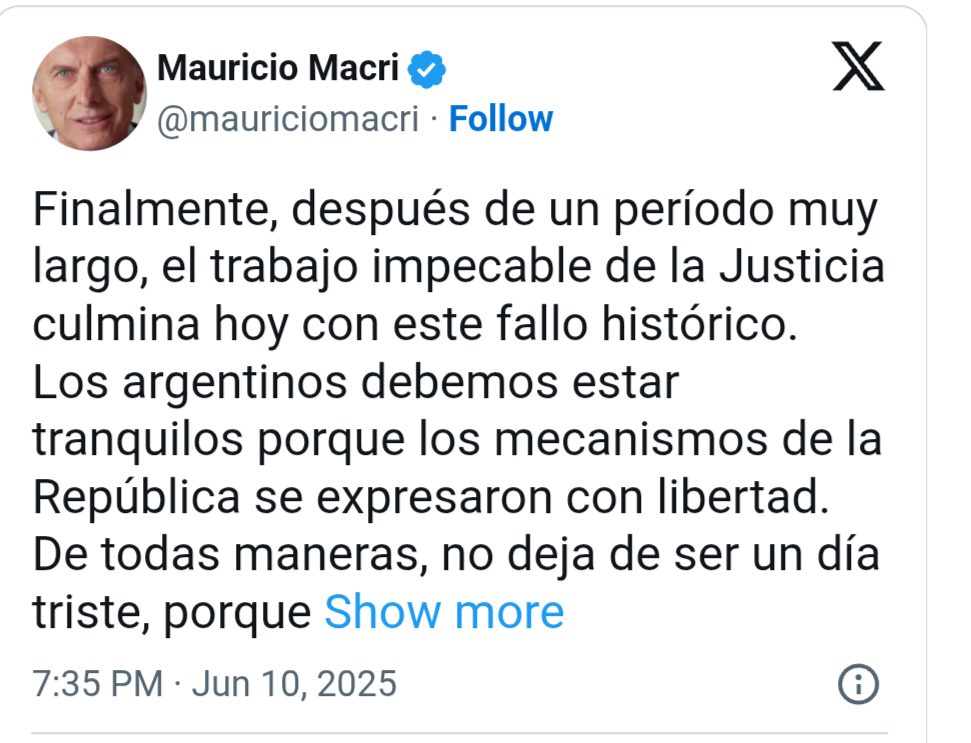 El posteo de Macri fue casi una oda al poder judicial. «Finalmente, después de un período muy largo, el trabajo impecable de la Justicia culmina hoy con este fallo histórico. Los argentinos debemos estar tranquilos porque los mecanismos de la República se expresaron con libertad», sostuvo. Milei, en cambio, aprovechó para pegarle también a «los periodistas» que, según él, hablaban de un supuesto «pacto de impunidad». «La República funciona y todos los periodi$ta$ corrupto$, cómplices de político$ mentiro$o$, han quedado expuesto en sus opereta$ sobre el supuesto pacto de impunidad» (SIC), escribió.
