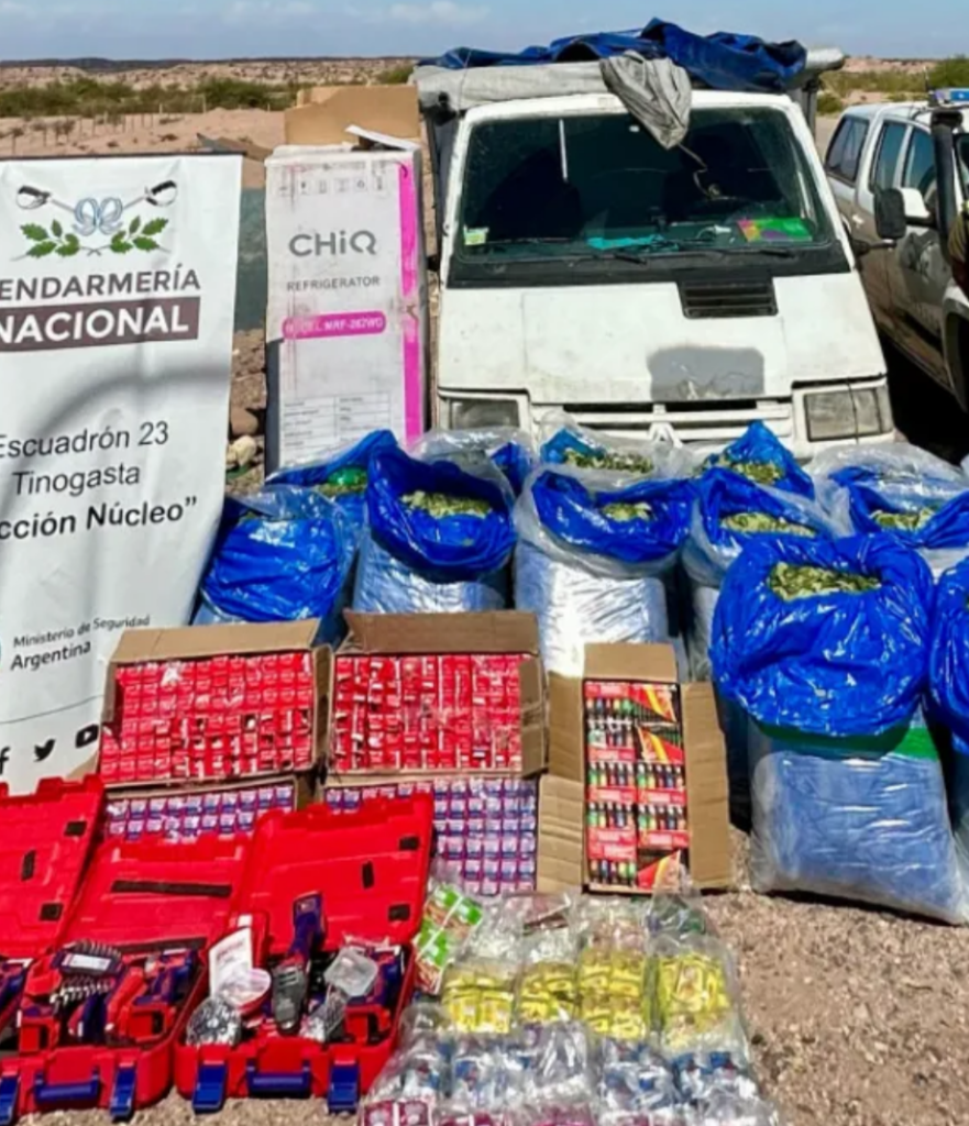 Siguiendo esta línea, detallaron que se procedió al secuestro de hojas de coca, en un peso total de 320 kilogramos, como así también 31 cubiertas, una heladera, y mercadería varia de distintos rubros, tales como 1.000 encendedores, 250 pomos de pasta dental, 2.300 bolsas de bicarbonato x 12 grs., y tres taladros.
