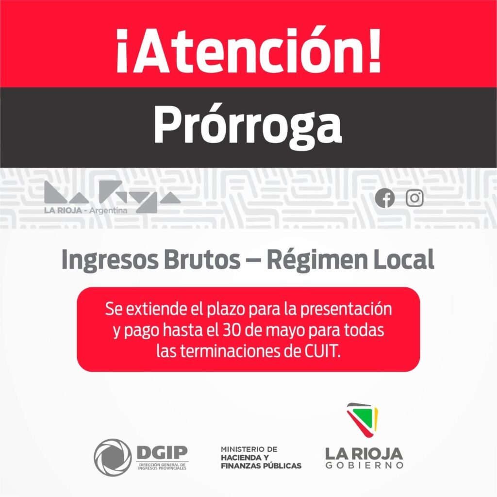 El Ministerio de Hacienda y Finanzas Públicas, a través de la Dirección General de Ingresos Provinciales (DGIP), informa que se ha dispuesto una prórroga para la presentación y el pago del Impuesto sobre los Ingresos Brutos – Régimen Local.