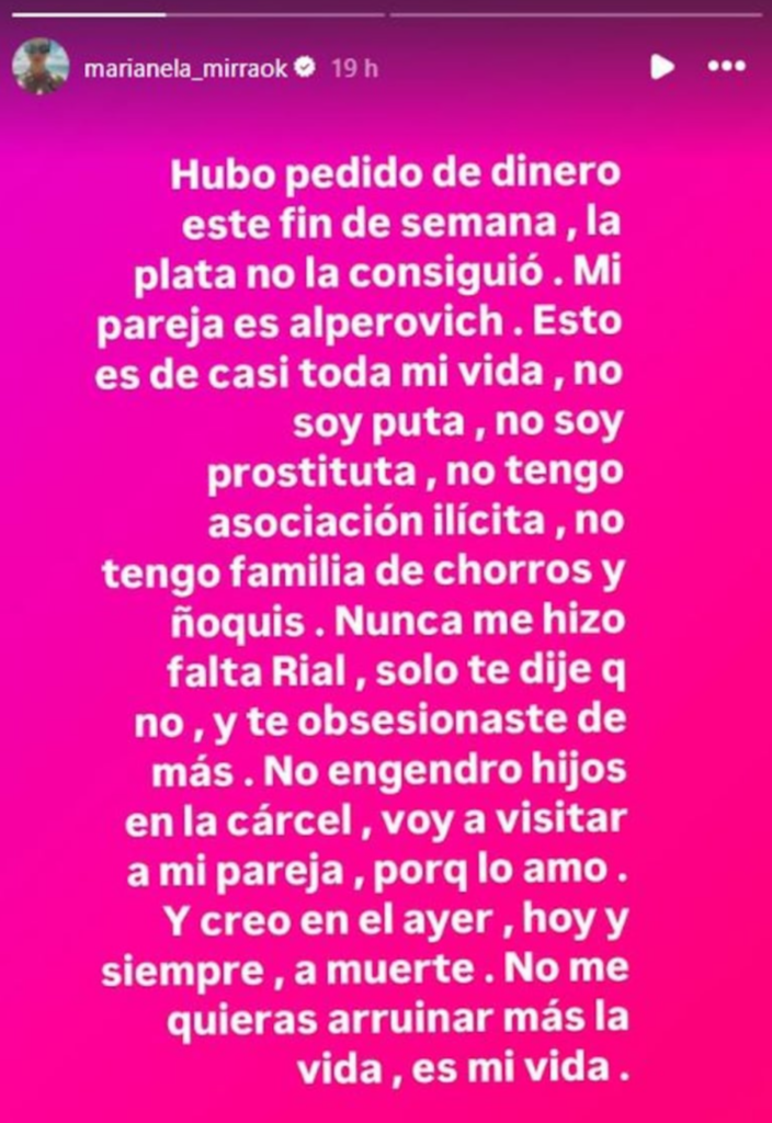 “Mi pareja es Alperovich. Esto es de casi toda mi vida, no soy puta, no tengo asociación ilícita, no tengo familia de chorros y ñoquis. Nunca me hizo falta Rial, solo te dije que no y te obsesionaste más”, anunció la mediática, haciendo referencia a un supuesto pedido de dinero que le habían hecho, extorsionándola con contar su relación si no pagaba.