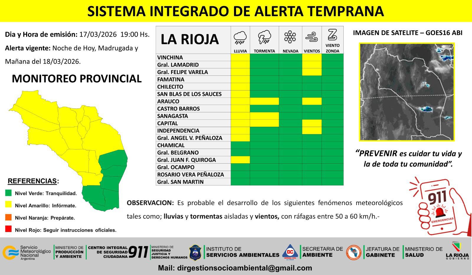 El Sistema Provincial de Emergencias La Rioja emitió un alerta amarilla por lluvias, tormentas aisladas y viento para distintos sectores…