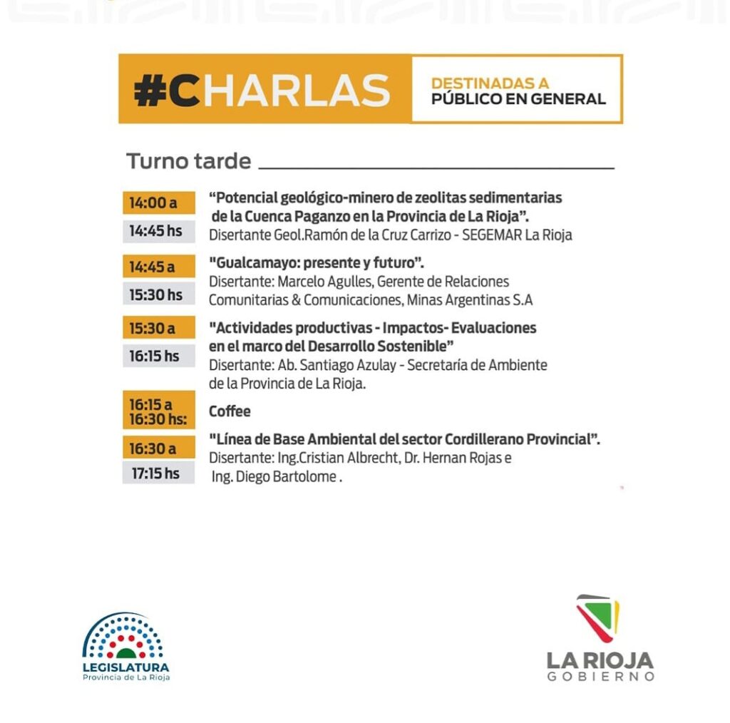 14:45 – Marcelo Agulles (gerente de Relaciones Comunitarias y Comunicaciones de Minas Argentinas S.A.) – «Gualcamayo: presente y futuro».