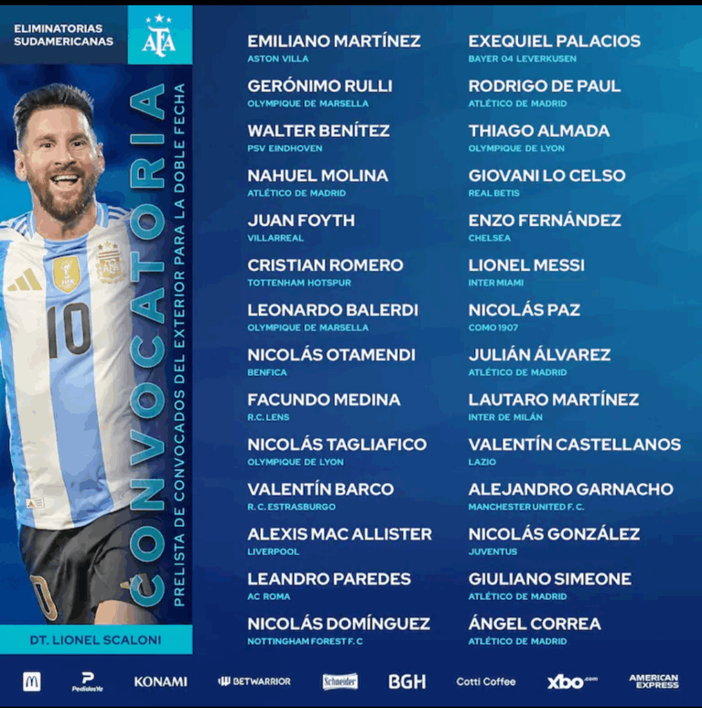 El dato más sobresaliente de esta lista es el retorno de Messi, ya que el capitán de la selección argentina estuvo afuera de los clásicos con Uruguay (triunfo por 1-0 en Montevideo) y Brasil (4-1 en el Monumental), por lesión. Luego de la doble jornada de eliminatorias, Messi estará en el partido inaugural del Mundial de Clubes, cuando Inter Miami juegue ante Al Ahly (Egipto), el sábado 14 de junio, en Miami.